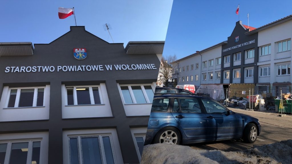 Siedziba Starostwa Powiatowego w Wołominie przy ulicy Prądzyńskiego przechodzi modernizację. Kilka miesięcy temu zniknęły słynne „schody do nieba”, którymi wspinali się mieszkańcy pragnący załatwić sprawy urzędowe. Budynek będzie bardzo przyjazny dla mieszkańców odwiedzających starostwo, będzie bardziej dostępny, funkcjonalny i estetyczny. Modernizacja potrwa jeszcze jakiś czas, a już dziś możemy zobaczyć fragment nowej elewacji budynku od ulicy Prądzyńskiego.
