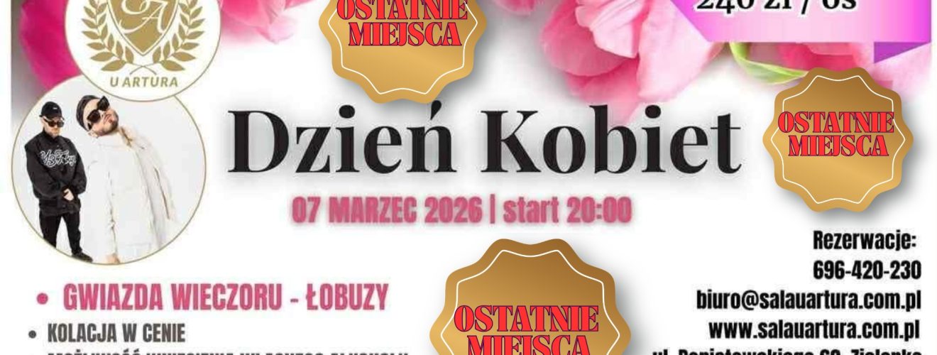 OSTATNIE MIEJSCA !!! – to już ostatnia chwila by fantastycznie spędzić sobotni wieczór 7 marca z okazji DNIA KOBIET. Wspaniałą zabawę zapewnia zielonkowska „Sala u Artura”. Gwiazdą wieczoru będzie znany i lubiany zespół ŁOBUZY. Wyśmienita kuchnia i atmosfera to gwarancja niezapomnianego wieczoru.