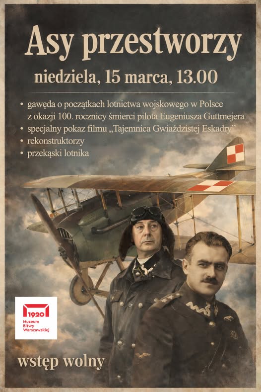 Asy przestworzy – spotkanie w Muzeum Bitwy Warszawskiej 1920 roku . W niedzielę, 15 marca o godz. 13:00 zapraszamy na wydarzenie poświęcone początkom lotnictwa wojskowego w Polsce! Podczas spotkania będziemy wspominać m.in. ppor. pil. Stefana Guttmajera – jednego z pionierów polskiego lotnictwa wojskowego w 100-lecie od śmierci oraz Meriana Coopera – pilotów walczących w czasie wojny polsko-bolszewickiej.