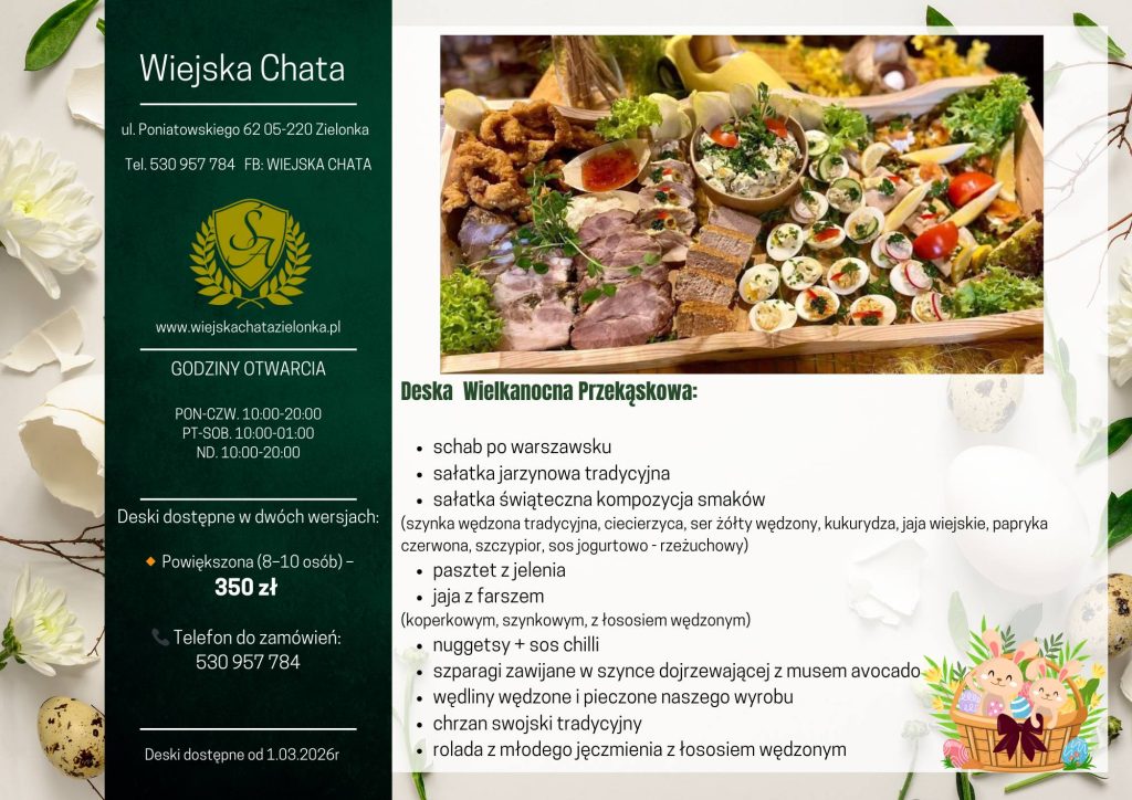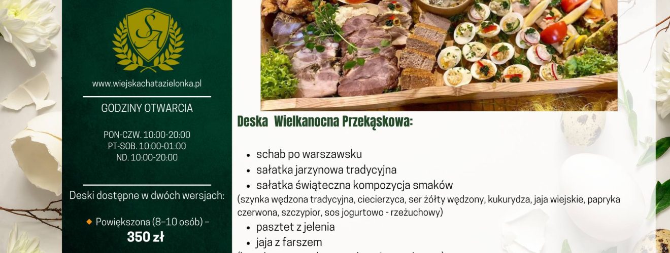 Już za miesiąc święta Wielkanocne mamy dla Was już gotowe słynne świąteczne deski od Artura Świerczewskiego z „Sali u Artura w Zielonce. Smaczne świąteczne deski cieszą się dużym powodzeniem zadowolonych klientów. Można już zamawiać ( od 1 marca). Pamiętajcie,że ilość desek jest ograniczona. Wszelkie informacje poniżej.