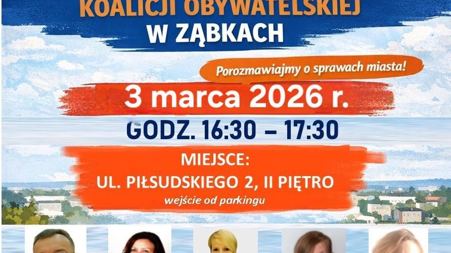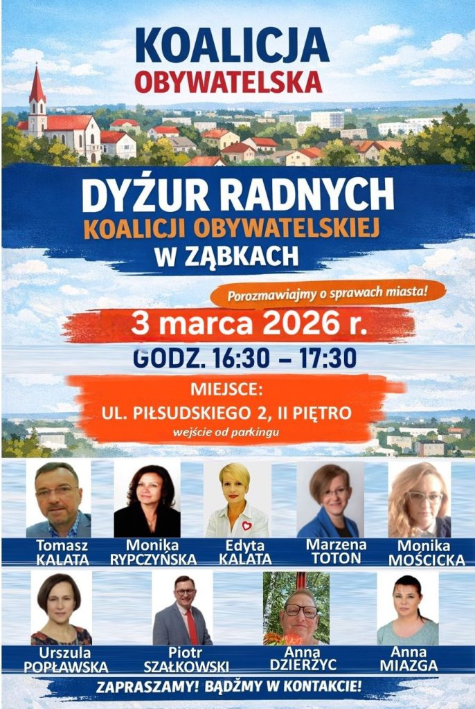 Tradycyjnie, w każdy wtorek, serdecznie zapraszamy na wspólny DYŻUR: Radnych oraz Członka Zarządu Powiatu Wołomińskiego. Jutro, 3 marca, widzimy się od godz. 16.30 na naszym spotkaniu. Podczas każdego dyżuru, obecni są również Członkowie Koalicji Obywatelskiej RP w Ząbkach. Każdy może przyjść, porozmawiać, wymienić poglądy, zgłosić swoje sugestie. Zapraszamy na II piętro (wejście od parkingu) Ząbki, ul. Piłsudskiego 2. Zapraszamy także do współpracy. Pod nr 603 360 494 czeka Przewodniczący KO w Ząbkach Tomasz Kalata![]()