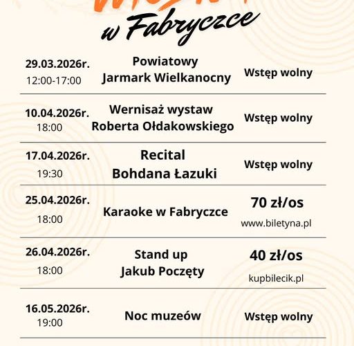 Przed nami kilka wyjątkowych wydarzeń, na które już dziś serdecznie Was zapraszamy!. W naszym wiosennym kalendarium znajdziecie m.in. Powiatowy Jarmark Wielkanocny, wernisaż wystaw Roberta Ołdakowskiego, recital Bohdana Łazuki, karaoke w Fabryczce, stand-up Jakuba Poczętego oraz Noc Muzeów. Część wydarzeń jest z wolnym wstępem, na część obowiązują bilety lub wejściówki. Więcej informacji o poszczególnych wydarzeniach znajdziecie na naszych profilach w mediach społecznościowych oraz na stronie internetowej. fabryczka.com.pl