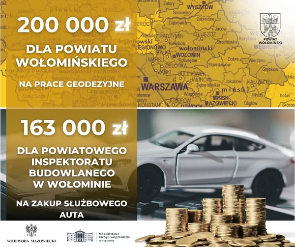 Decyzją Wojewody Mazowieckiego Mariusz R. Frankowski do naszego powiatu trafią środki na ważne zadania związane z bezpieczeństwem i porządkiem przestrzennym. 𝟭𝟲𝟯 𝘁𝘆𝘀. 𝘇ł zostanie przeznaczone na zakup służbowego samochodu dla Powiatowego Inspektoratu Nadzoru Budowlanego w Wołominie, co usprawni codzienną pracę i kontrole w terenie. Dodatkowo 𝟮𝟬𝟬 𝘁𝘆𝘀. 𝘇ł wesprze prace geodezyjne polegające na doprowadzeniu do zgodności przebiegu granic pomiędzy powiatem wołomińskim, węgrowskim i wyszkowskim. To działania, które przekładają się na lepsze zarządzanie przestrzenią i sprawniejsze funkcjonowanie administracji.