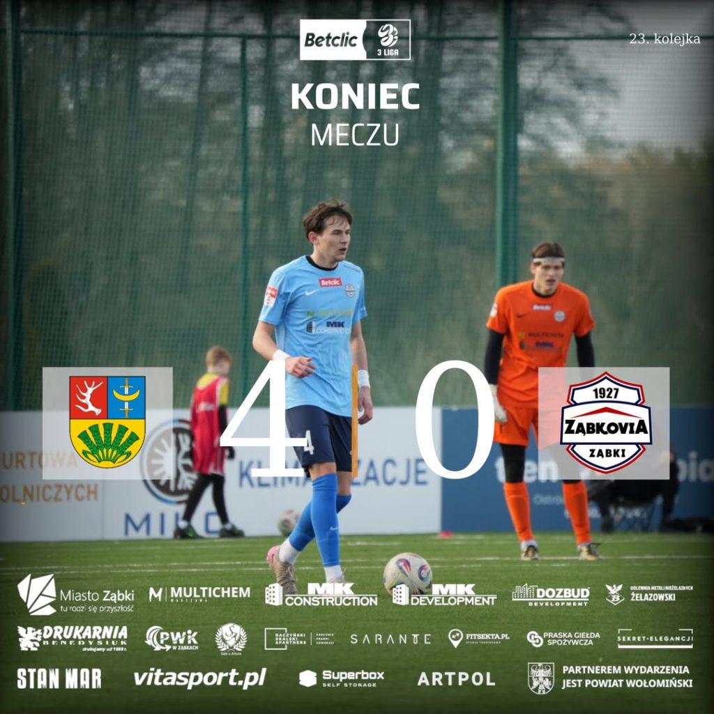 III liga piłkarska. MKS ZĄBKOVIA Ząbki niestety poniosła już czwartą porażkę w rundzie wiosennej 2026. Tym razem w Troszynie przegrała aż 0:4. Prawdopodobnie marzenia o awansie do II ligi trzeba będzie odłożyć na kolejny sezon. Zła passa piłkarzy z Ząbek niestety trwa.