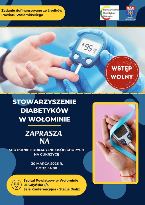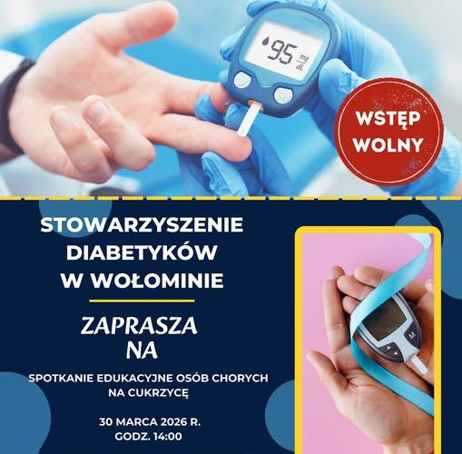 Zdrowie zaczyna się od wiedzy i profilaktyki. Już 30 marca zapraszamy na bezpłatne spotkanie edukacyjne dla osób chorujących na cukrzycę – organizowane przez Stowarzyszenie Diabetyków w Wołominie oraz dofinansowane przez Powiat Wołomiński. Szczegóły spotkania: Szpital Matki Bożej Nieustającej Pomocy w Wołominie, 30 marca 2026 r. godz. 14:00. Wstęp wolny! Warto przyjść, posłuchać i dowiedzieć się więcej.