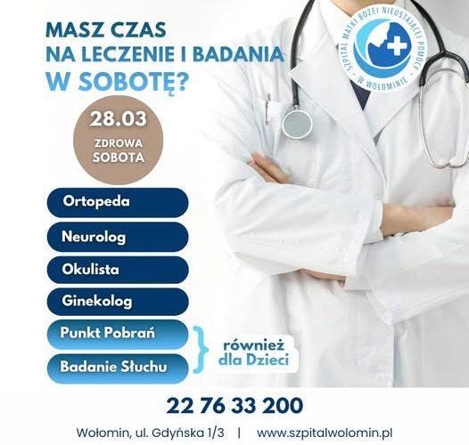 Wiemy, jak ważny jest dla Państwa dostęp do lekarzy i profilaktyki w dni wolne. W lutym z tej możliwości skorzystało aż 500 osób. Tak duża frekwencja to dla nas jasny sygnał, by ułatwiać Państwu regularne dbanie o zdrowie w SOBOTY. Wiosenne przesilenie bywa wyzwaniem dla organizmu, dlatego informujemy o kolejnej „ZDROWEJ SOBOCIE”, która odbędzie się JUŻ W TYM TYGODNIU, 28 marca. Kogo spotkacie w tę sobotę w naszych gabinetach? 22 76 33 200 (pon-czw 7:00-19:00, pt 7:00-18:00)