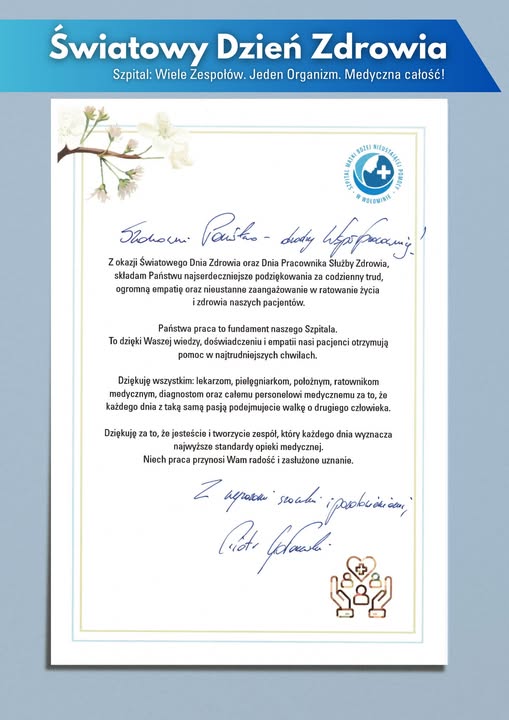Dziś świętujemy Światowy Dzień Zdrowia i Dzień Pracownika Służby Zdrowia!. W tym szczególnym dniu kierujemy nasze kroki i myśli ku tym, którzy stanowią fundament naszego Szpitala. To dzięki Waszej wiedzy i doświadczeniu nasi pacjenci otrzymują pomoc w najtrudniejszych chwilach. Dziś wspólnie świętujemy ZDROWIE – największą wartość, którą razem chronimy. PS: Nasz Szpital to potężny, współpracujący organizm – wiele różnych ZESPOŁÓW codziennie tworzy u nas spójną, medyczną jedność.