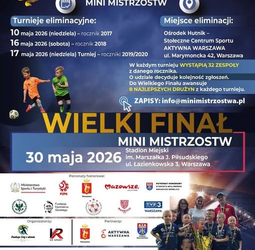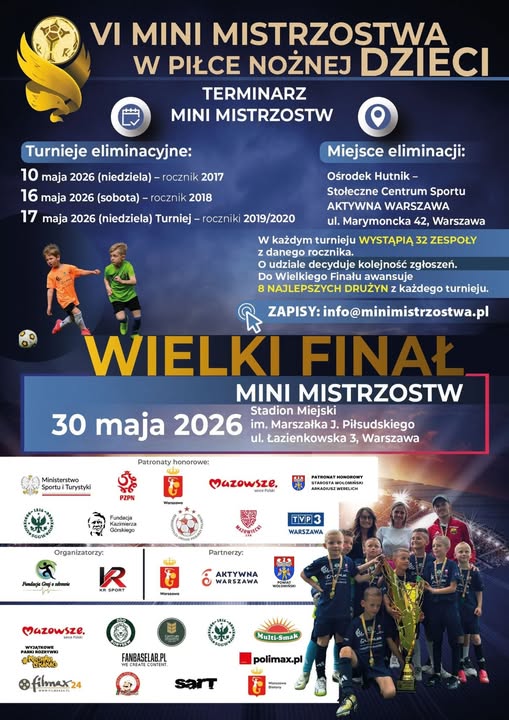 ZGŁOSZENIA info@minimistrzostwa.pl 535 967 609. W każdym turnieju tylko 32 drużyny! 𝗘𝗟𝗜𝗠𝗜𝗡𝗔𝗖𝗝𝗘: 10.05.2026 – rocznik 2017, 16.05.2026 – rocznik 2018, 17.05.2026 – roczniki 2019 / 2020 Ośrodek Hutnik – Aktywna Warszawa ul. Marymoncka 44. 𝗪𝗜𝗘𝗟𝗞𝗜 𝗙𝗜𝗡𝗔Ł: 30.05.2026 Stadion Miejski Legii Warszawa przy ul. Łazienkowskiej 3.