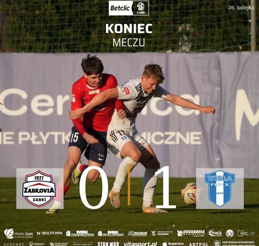 W sobotnim spotkaniu III ligi piłkarskiej wszyscy żyli nadzieją na przełamanie fatalnej passy wiosennej ( 8 porażek) zespołu ZĄBKOVI Ząbki. Niestety i tym razem gospodarze spotkania z WISŁA II Płock nie zdobyli ani jednej bramki i ani jednego punktu. Porażka 0:1 i drużyna z Ząbek już 9 raz schodzi z boiska pokonana. W ligowej tabeli pozostaje z jesiennym dorobkiem 38 punktów i zajmuje 8 miejsce.