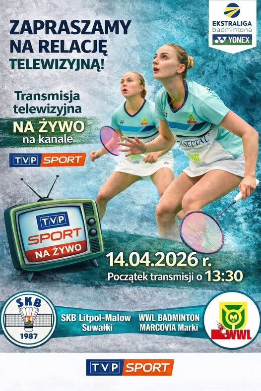 Już we wtorek, rozegramy kolejka – 14.04.2026 r. – Suwałki SKB Litpol-Malow Suwałki – WWL Badminton Marcovia Marki , a naszym przeciwnikiem będzie Suwalski Klub Badmintona. Mecz odbędzie się w Hali Widowiskowo Sportowej 𝗦𝘂𝘄𝗮ł𝗸𝗶 𝗔𝗿𝗲𝗻𝗮, przy ul. Zarzecze 26 o godzinie 𝟭3:𝟯𝟬. Transmisja telewizyjna 𝗻𝗮 𝘇̇𝘆𝘄𝗼 zostanie wyemitowana na kanale 𝗧𝗩𝗣 𝗦𝗽𝗼𝗿𝘁. Początek transmisji o 13:30. SKB Litpol – Malow Suwałki – WWL Badminton Marcovia Marki, 14.04.2026r. 13:30 | Hala Suwałki Arena; ul. Zarzecze 26 | Suwałki